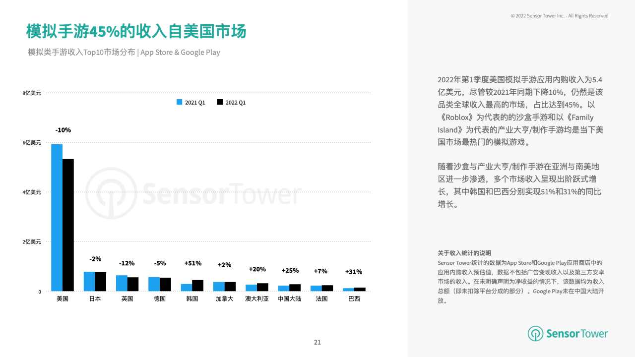 2022年第1季度美国模仿手游使用内购收入为5.4亿美元,虽然较2021年同期下降10%,仍然是该品类全球收入最高的商场,占该品类全球收入的45%。以《Roblox》为代表的沙盒手游,以《Family Island》为代表的工业大亨/制造手游,均是当下美国商场最抢手的模仿游戏。