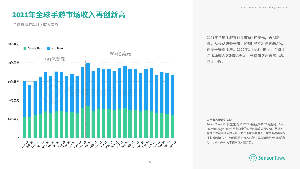 2021年全球手游玩家开销约884亿美元,再创新高。从移动设备来看,iOS用户开销占59.1%,略高于安卓用户。2022年1月至5月期间,全球手游商场使用内购收入为348亿美元,在疫情之后初次出现同比下降。