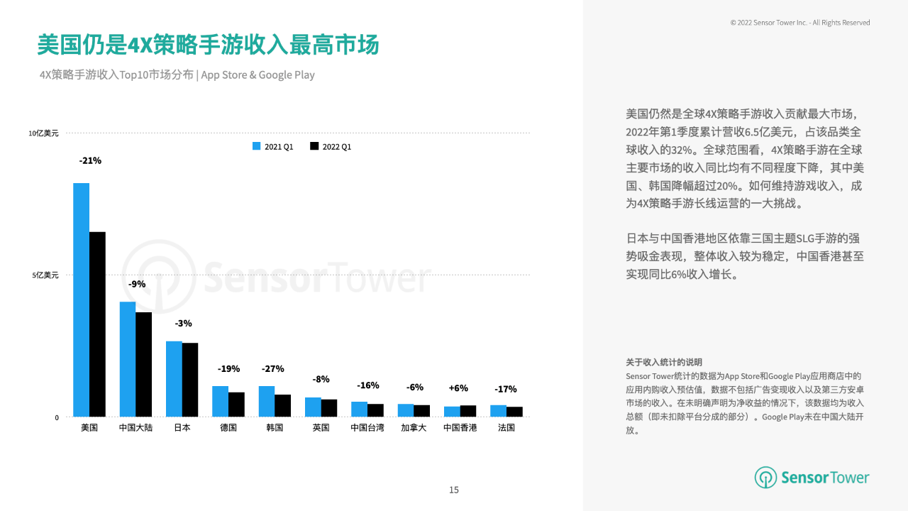 美国仍然是全球4X战略手游收入奉献最大商场,2022年第1季度奉献了6.5亿美元,占该品类全球收入的32%。日本与我国香港区域依托三国主题SLG手游的强势吸金体现,全体收入较为安稳,我国香港乃至完成同比6%收入增加。