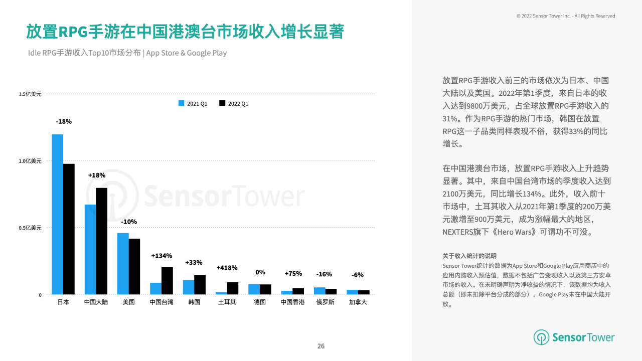 放置RPG手游收入前三的商场依次为日本、我国大陆以及美国。2022年第1季度,来自日本的收入到达9800万美元,占全球放置RPG手游收入的31%。作为RPG手游的抢手商场,韩国在放置RPG这一子品类相同体现不俗,取得33%的同比增加。