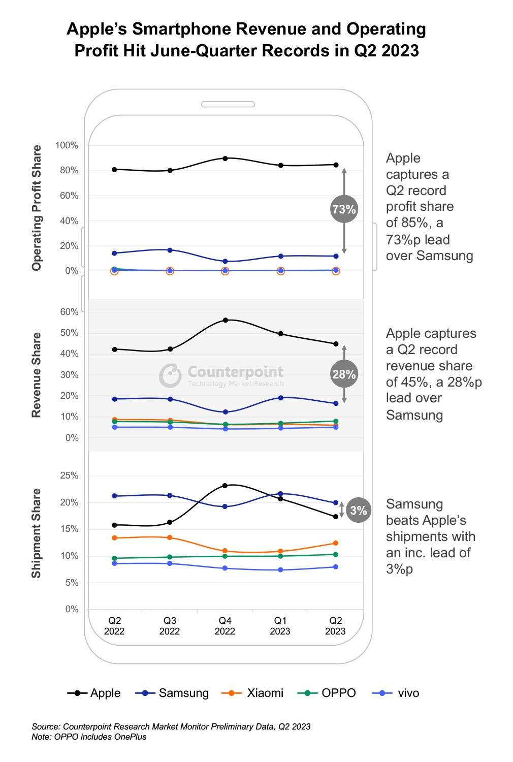 - 第二季度,苹果公司在全球智能手机营收和经营赢利方面抢先,这二者的比例别离到达45%和85%,创下最高季度纪录;